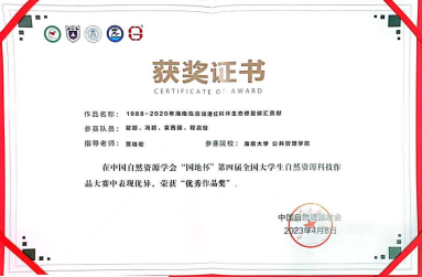 2023年4月8日,“国地杯”第四届全国老员工自然资源科技作品大赛在内蒙古呼和浩特顺利落下帷幕。公司由土地资源管理专业2020级本科生瞿颖、袁西丽、程嘉璇同学及2019级冯颖同学组成的“红树林碳汇先锋队”在贾培宏教授的指导下完成的作品《1988-2020年海南岛清澜港红树林生态修复碳汇贡献》荣获“优秀作品奖”。
