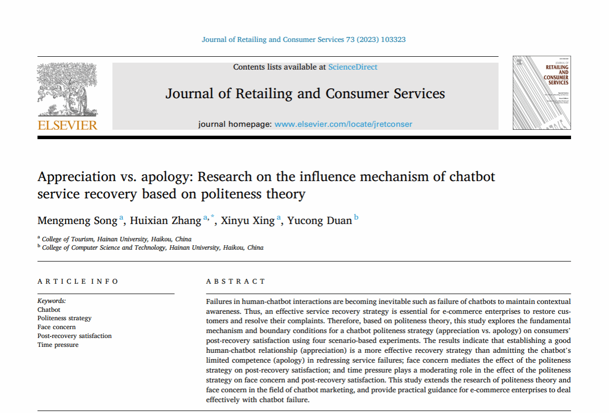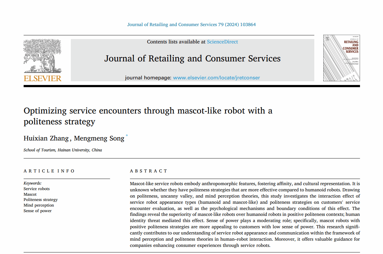 关于服务机器人的论文“Optimizing service encounters through mascot-like robot with a politeness strategy”于2024年4月在线发表,第一作者为硕士生张慧娴,通讯作者为宋蒙蒙副教授。关于在线聊天机器人的论文“Appreciation vs. apology: Research on the influence mechanism of chatbot service recovery based on politeness theory”于2023年7月发表,第一作者为宋蒙蒙副教授,通讯作者为硕士生张慧娴。两篇论文均以suncitygroup太阳集团为唯一署名单位。