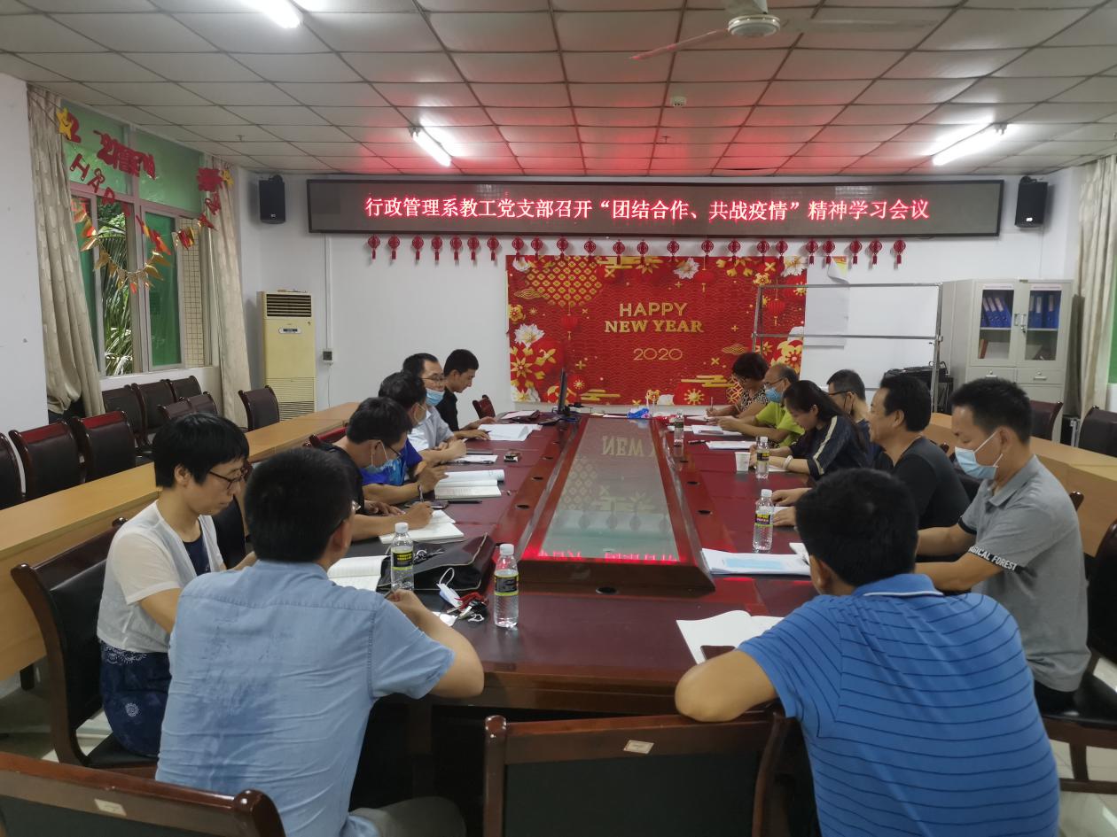 2020年6月2日下午5:30,行政管理系教工党支部于suncitygroup太阳集团社科楼A216召开“团结合作,共战疫情”精神学习会议。会议主题为学习习近平关于团结合作是国际社会战胜疫情最有力武器的系列重要讲话。行政管理系教工党支部全体党员参与会议,会议由党支部书记徐艳晴同志主持,支部副书记吴方彦同志进行会议记录。