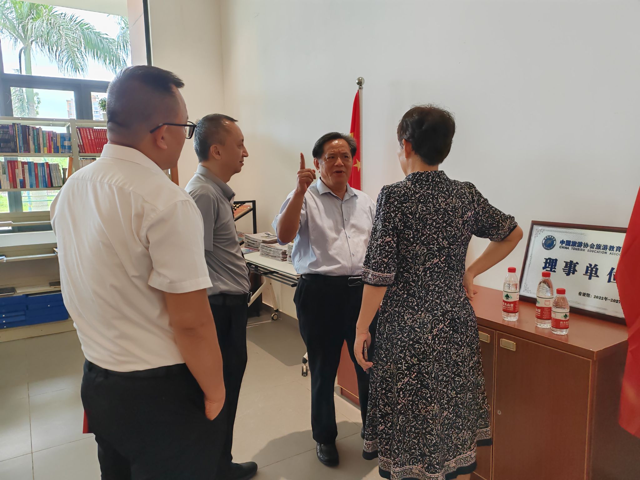 2024年5月29日,教育部党建工作联络员谭基虎、组织部副部长王远露、凤翔书公司党委副书记郭孝伟到观澜湖校区,列席旁听国际旅游公司2024年第13次党委会,并提出指导意见。