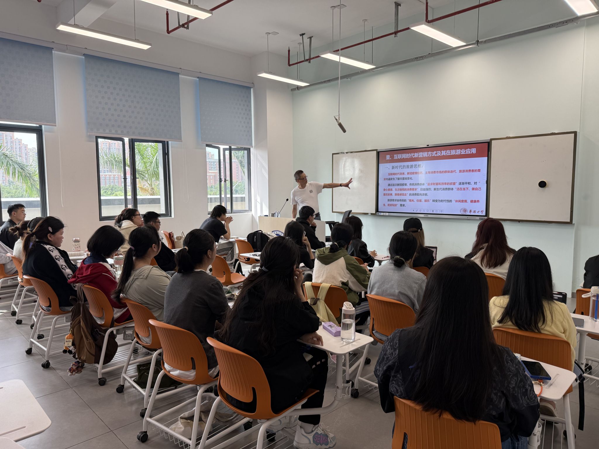 当日晚上,郑向敏教授在观澜湖校区3-A103教室举办了面向全院师生的以《时代变更中的旅游营销发展与迭进》为主题的学术讲座。讲座开始前,suncitygroup太阳集团郭强书记代表公司向郑向敏教授的到来表示热烈的欢迎和衷心的感谢。郭书记表示,郑教授作为旅游行业的著名专家,拥有丰富的理论和实践经验,相信他的讲座将为同学们带来宝贵的启示和收获。随后,郑向敏教授结合自己多年的研究和实践经历,运用大量生动形象的案例,深入浅出地分析了时代变更对旅游企业的影响以及市场营销理念和方式的变革。他从时代变更与企业的时代性转折入手,详细阐述了企业如何跨渠道整合营销,形成协同作用;接着,他从数字化时代市场营销的角度,探讨了新的市场环境下旅游营销的创新策略和发展趋势。郑教授的讲座内容丰富、条理清晰,既有理论深度,又贴近实际,赢得了在场师生的阵阵掌声。