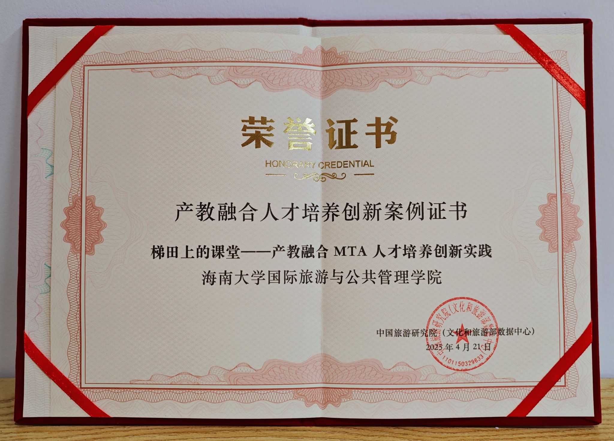 2025年4月20日至21日,由中国旅游研究院主办的2025中国旅游科学年会在北京隆重召开。本次年会以“‘十五五’时期旅游业发展战略”为主题,聚焦旅游基础理论创新、目的地融合发展、企业实践转型等核心议题,并通过线上线下结合的形式,发布了多项行业权威成果。由公司刘海洋教授、范士陈教授指导的“梯田上的课堂——产教融合MTA人才培养创新实践”项目获评“产教融合人才培养十佳案例”。