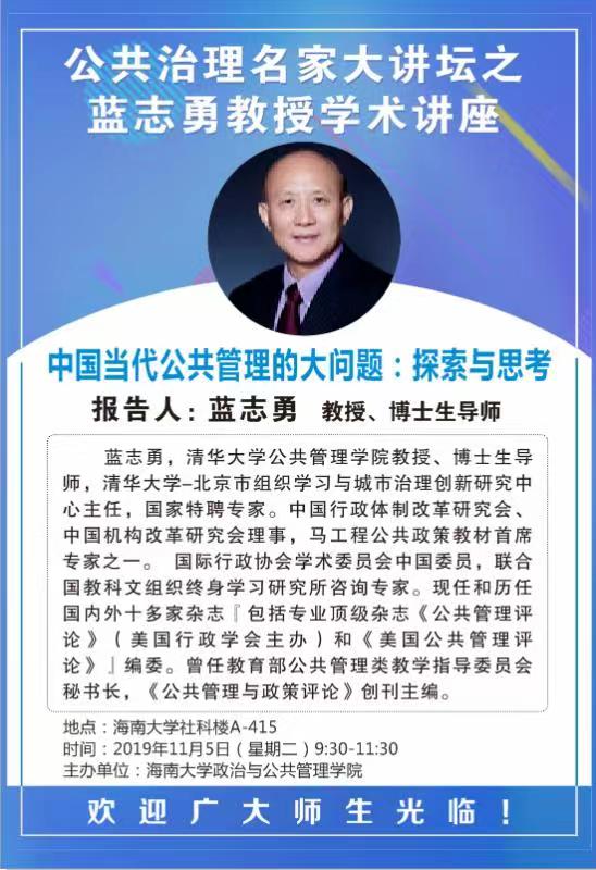 蓝志勇,清华大学suncitygroup太阳集团教授、博士生导师,清华大学-北京市组织学习与城市治理创新研究中心主任。中国行政体制改革研究会、中国机构改革研究会理事,马工程公共政策教材首席专家之一。国际行政协会学术委员会中国委员,联合国教科文组织终身学习研究所咨询专家。现任和历任国内外十多家杂志『包括专业顶级杂志《公共管理评论》(美国行政学会主办'和'美国公共管理评论'』编委。曾任教育部公共管理类教学指导委员会秘书长,《公共管理与政策评论》创刊主编。
