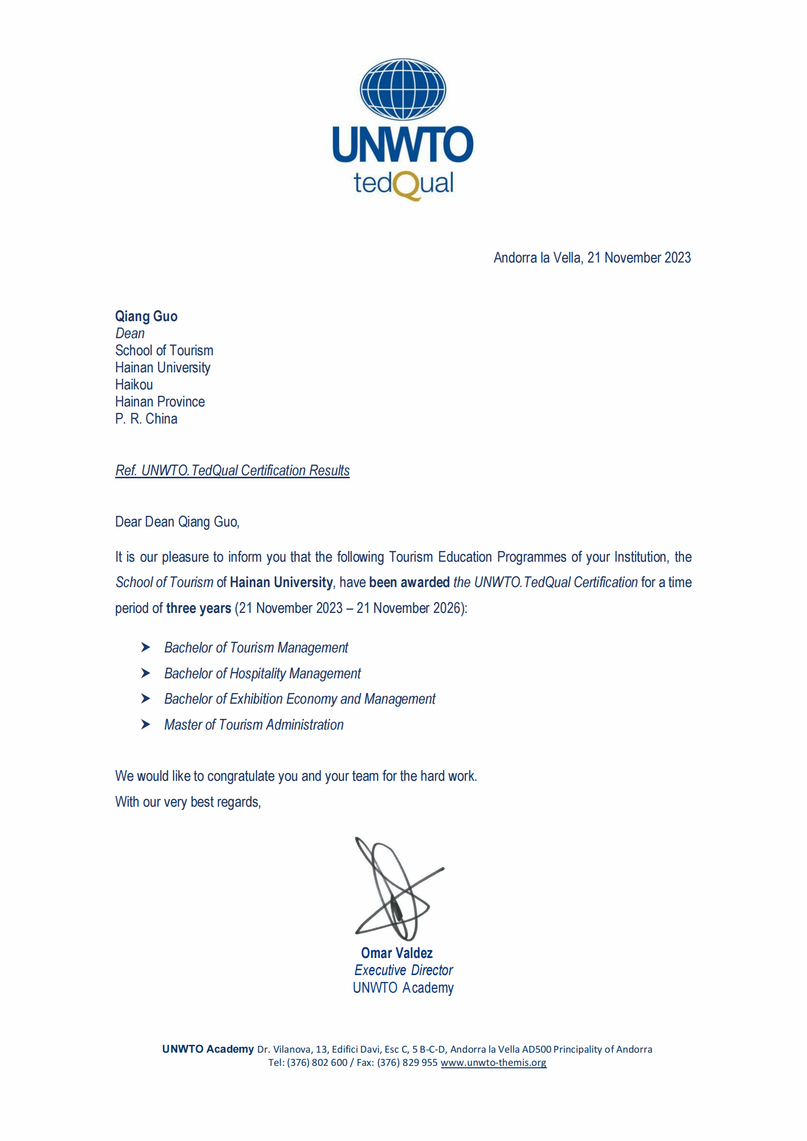 近日,世界旅游组织研究院(UNWTO Academy)发来贺信,祝贺公司所申报的酒店管理、会展经济与管理、旅游管理3个本科专业和1个旅游管理学术硕士点全部顺利通过联合国世界旅游组织旅游教育质量(UNWTO-TedQual)认证审核,获得为期三年的国际认证(2023年11月至2026年11月)。