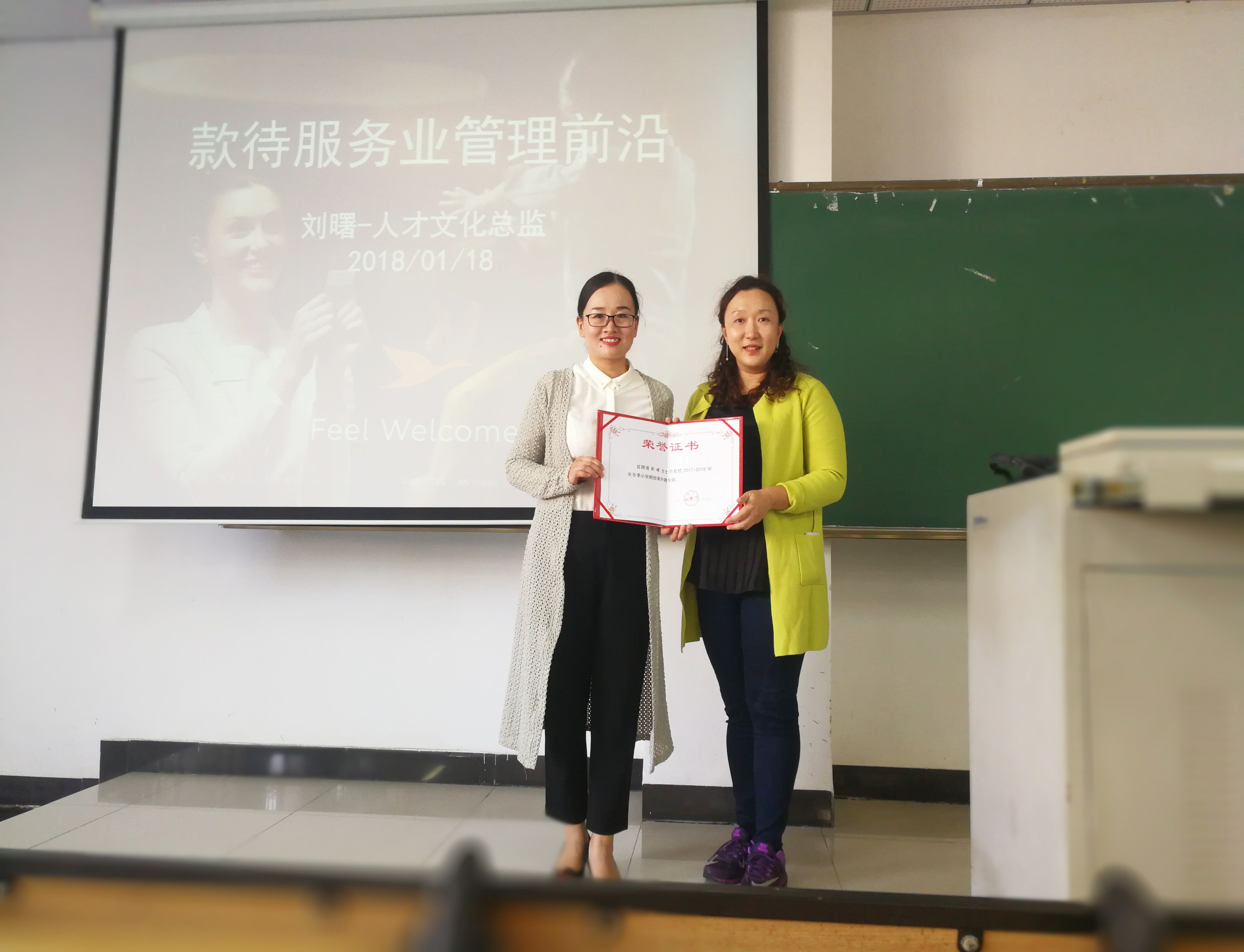 2018年1月18日下午,雅高酒店集团三亚湾海居铂尔曼度假酒店人才与文化总监刘曙女士应邀为suncitygroup太阳集团16级酒店管理专业员工教授冬季小学期授课,讲座围绕款待服务业管理前沿相关知识展开。本次讲座由酒店管理系主任杜肖寒老师主持,并向刘曙女士颁发“冬季小学期校外专家”聘书。
