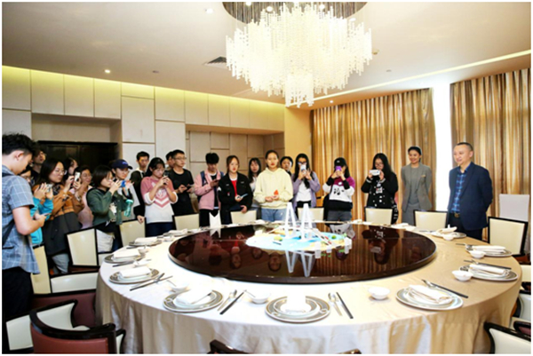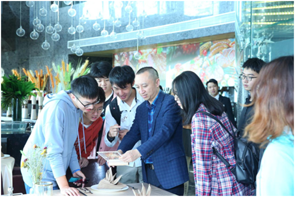 首先,郭强经理通过实地参观酒店三楼、四楼和三十三楼,并就餐厅接待方面进行细心讲解。在三楼宴会厅参观婚礼晚宴场地,对餐饮、婚礼晚宴和客人接待等方面有了初步的了解,更对书本中的理论有了更为深刻的记忆;四楼参观中餐厅时,通过郭强经理耐心的讲解,对餐厅装修风格、转盘装饰和餐厅主题相搭配营造出中式盛宴的视觉效果有了更独到的见解;此外,在酒店三十三楼的特色餐厅和全日餐厅参观时,何经理对餐厅进行基本介绍,之后郭经理为同学们讲解了餐厅选景的意义和相关菜品英文的合理表达以及如何利用英文对中式菜品进行简单介绍,让同学们意识到当今社会对复合型和创新性人才需求的重要性。