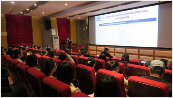 本次讲座,安金明研究员结合自己的亲身经历,为广大师生讲述了旅游主体社会责任及思考和未来旅游变革,提出了文化旅游发展的十条建议,并对新时代旅游变革进行了分析讨论。安金明研究员的专题讲座有理论、有案例、有新意、有内涵,内容丰富多彩,讲解深入浅出,同学们感觉获益匪浅。讲座报告结束后,同学们踊跃提问,安金明研究员一一做了认真回答,讲座在大家的热烈掌声中圆满结束!
