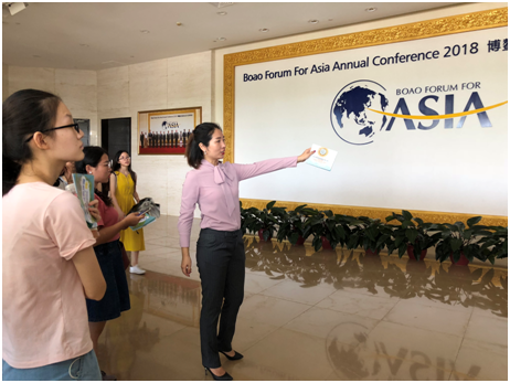 6月10日上午,实践团队按计划来到博鳌亚洲论坛会场所在地——琼海市博鳌镇东屿岛,在中远海运博鳌国际会务有限公司市场总监周颖的带领下,同学们主要参观了博鳌亚洲论坛新闻中心、国际会议中心及云亭等标志性场所,近距离的了解到博鳌亚洲论坛的创办历史、论坛规模、年会发展及主要流程。最后,中远海运博鳌国际会务有限公司副总经理王俊丽女士和人事总监刘晶晶女士和大家亲切座谈。