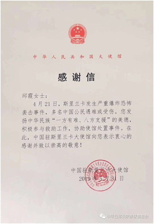 2019年4月21日,斯里兰卡发生严重爆炸恐怖袭击,多名中国公民遇难或受伤,公司员工邱霞发扬中华民族“一方有难、八方支援”的美德,积极参与救助工作,协助中国驻斯里兰卡大使馆处置事件,受到了大使馆的表扬及感谢,并发了感谢信!