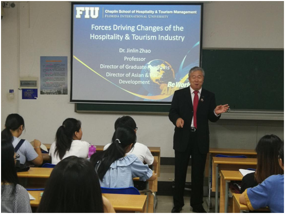 5月27日至6月5日期间,suncitygroup太阳集团旅游公司2017级酒店管理专业两个班104位同学迎来了美国弗罗里达国际大学旅游与酒店管理公司终身教授赵金林博士的全英文授课。赵金林教授以酒店业战略发展和创新管理为主题,设计了Forces driving change、Competitive methods、Franchise and management contract、An environmentally sensitive approach等四个讲授主题和一次小组作业考核(Group presentation),两个班的小组作业重点考核了同学们用驱动力模型、环境分析模型等对酒店集团进行了分析并进行了PPT全英文分享,最后,赵教授对各小组的研究成果进行了点评。