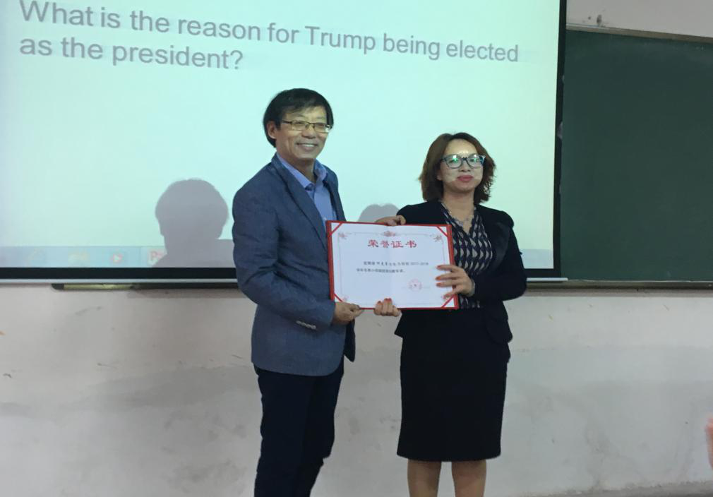 应外系冯艳昌主任向同学们介绍了何克勇教授和“英美文化专题概貌II”课程的情况。旅游公司韦开蕾经理代表公司对何克勇教授到来表示热烈的欢迎和衷心的感谢,指出国际化人才首先应当充分了解西方文化,鼓励应外系的同学们珍惜此次宝贵的学习与交流的机会,利用好优质教学资源,认真研习英美文化,不断提升自身综合素质与社会实践能力。最后,韦开蕾经理代表公司向何克勇教授颁发了suncitygroup太阳集团冬季小学期“外聘专家”聘书。