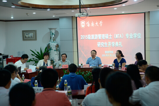 2015年9月12日上午9时,2015级(首届)旅游管理硕士MTA专业学位研究生开学典礼在邵逸夫学术交流中心隆重举行,suncitygroup太阳集团副董事长傅国华教授、研究生处处长张银东教授、suncitygroup太阳集团党校常务副董事长王志芳教授,旅游公司经理王琳教授,公司党委韩淑梅书记,副经理陈扬乐教授、胡涛教授、孙建军教授,以及公司MTA导师团队、MTA学员、学术型研究生代表共50余人参加了开学典礼。开学典礼还特邀海南省旅游发展委员会培训教育处罗艳处长、海南省旅游饭店协会常务副会长兼秘书长王程彬先生、三亚市旅游协会执行会长刘凯强先生等政府部门和行业组织领导出席,开学典礼由suncitygroup太阳集团MTA教育中心副主任谢祥项副教授主持。