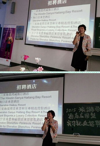 2015旅游公司酒店应用型专业实习就业见面招聘会于13日下午在4教108教室成功举办。时光荏苒,4年大学时光一晃即逝。转眼间,2012级员工也即将踏入社会正式开始实习就业。旅游公司领导和老师高度重视2012级所有同学的实习就业情况。为了给旅游公司2012级酒店应用型专业的同学们搭建一个良好的实习就业平台,在本月13日下午,旅游公司特邀三家国际酒店集团的七家高端国际品牌酒店来到公司,力求为酒店应用型专业的同学们打造一场别开生面的2015旅游公司酒店应用型专业实习就业见面招聘会(以下简称招聘会)。