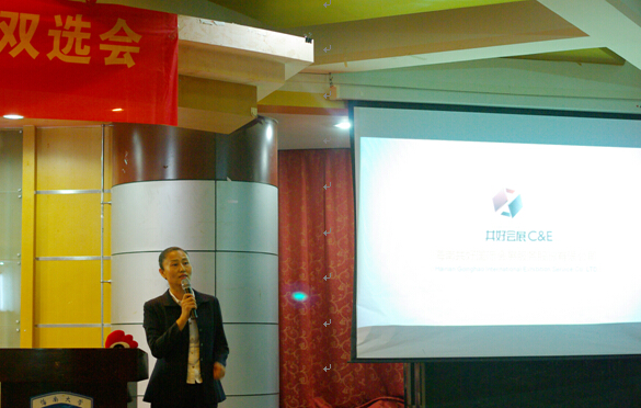 10月13日下午,由旅游公司会展经济与管理系主办的首届实操实践企业双选会暨毕业生就业见面交流会,在旅游公司多功能厅隆重举行。旅游公司王琳经理、郭强副经理、胡涛副经理、海口市会议展览业协会杨学功会长、15家海南会展业顶尖企业的董事长、总经理携各自企业人力资源部门负责人出席本次活动。活动吸引了旅游公司会展经济与管理系教师代表及近300名旅游公司和其他公司员工参与本次活动。活动由会展系耿松涛副教授主持。整场活动分为开幕式、企业推介、员工代表自荐、面向13级实操实习员工的企业双选交流会、面对12级应届毕业生的企业见面会等多个环节。开幕式上,郭强副经理就旅游公司会展经济与管理系基本情况以及公司对会展经济与管理专业的支持向大家进行介绍,并向给予本次活动大力支持和帮助的各方领导与企业表示热烈的欢迎和诚挚的感谢。海口市会议展览业协会杨学功会长的致辞,传达了海南会展业发展的新的政策,并强调会展业作为海南省“十三五”规划的12个重点发展的产业之一,是极具潜力的,希望会展学子抓住机会,积极投身未来海南会展业的建设。其后播放了会展专业员工特意为此次活动制作的专业宣传片和班级宣传片,会展专业的巨大进步和快速成长以及会展学子的青春活力赢得了现场公司领导、企业嘉宾和员工的热烈掌声。