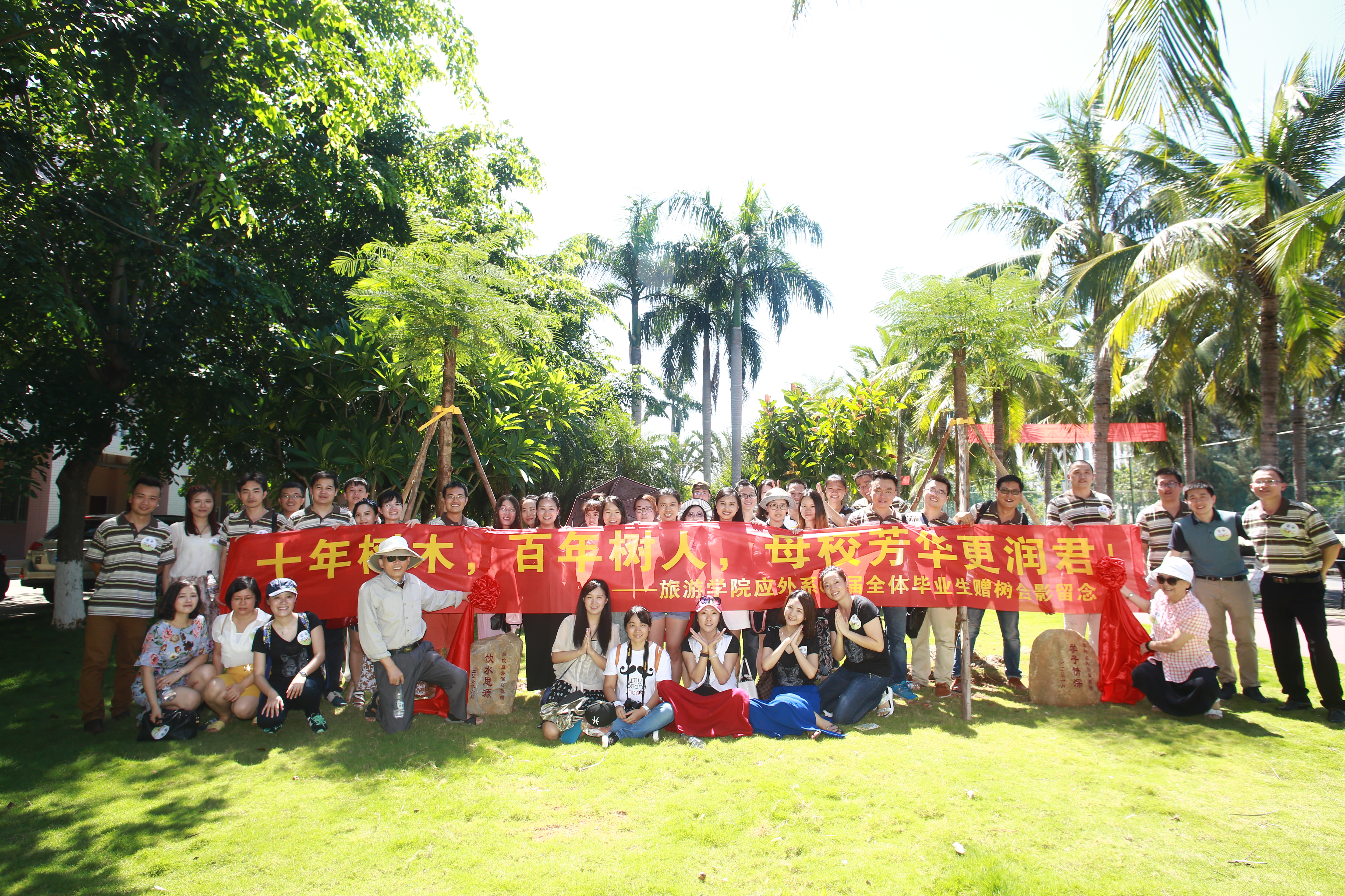 随后,员工们和老师们一起在6号教学楼前草坪上种下两株凤凰木,寓意着每当凤凰花开时节,就是员工们荣归母校之际,祝福旅游公司学子走向全国、走向世界,取得更加辉煌的成就。