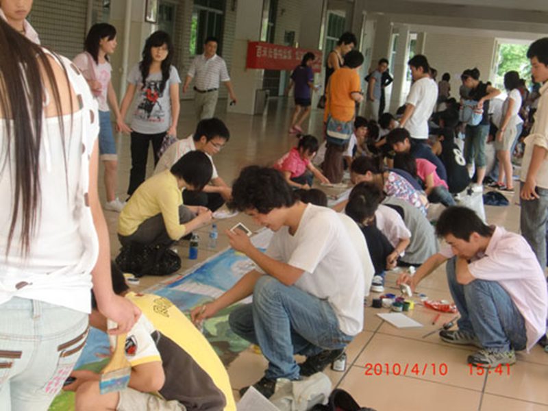 2010年4月10日下午,以“百米长卷构蓝图,低碳绿岛我来绘”为主题的旅游公司第九届“旅游风采节”之百米书画大赛在旅游公司三号楼大厅举行。赛前,我们有幸邀请到书法协会会长汪君昌,美术协会会长张金海,风飏动漫社社长刘强以及艺术公司、法公司、海洋公司、经济公司等兄弟公司的宣传部部长作为本次比赛的评委。大赛形式以班级为小组参赛,涉及公司09、08、07级的36个在校班级,每个班级为一个参赛小组,各班自带工具,在事先画定的范围内(约1.5米)现场书画。