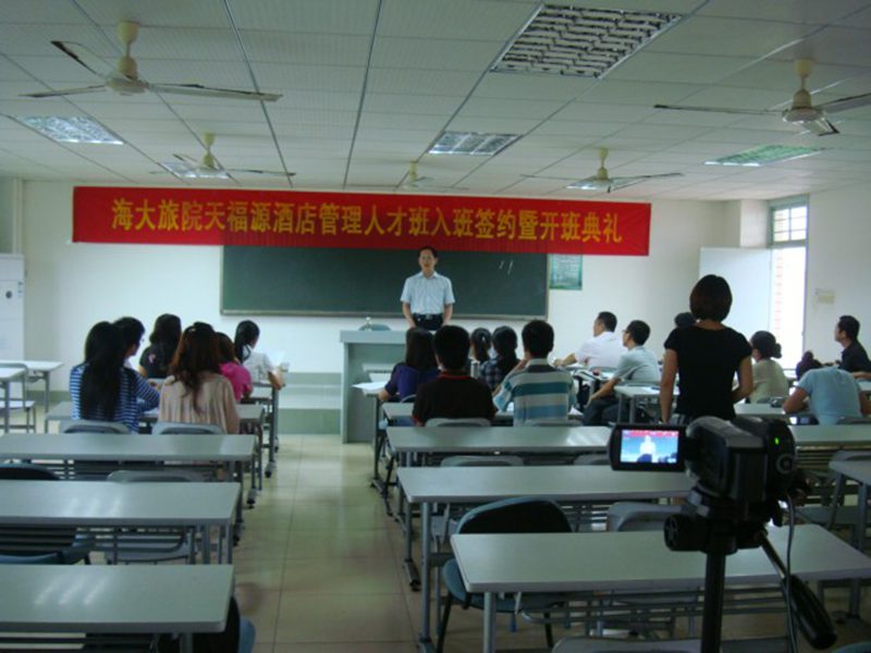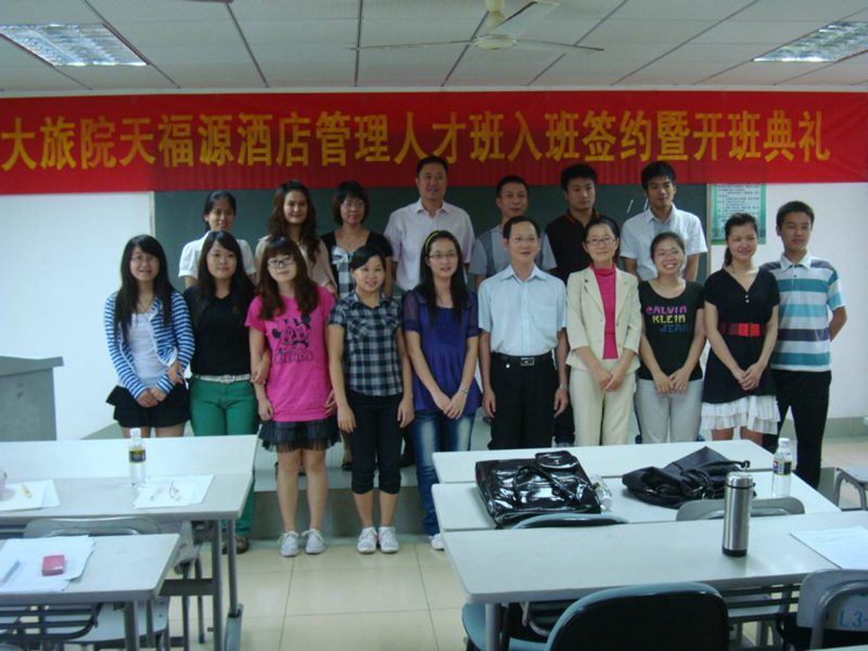 海大旅院天福源酒店管理人才班自2010年下半学期开始筹划。该班由suncitygroup太阳集团旅游公司2008级员工通过自愿报名、面试等方式挑选出来的12名出类拔萃的员工组成。“人才班”的开设不仅为老员工提供实习的平台,还让这些同学在毕业后可免去在酒店的试用期,更好的让老员工适应酒店工作的环境。“人才班”还为这些员工制定出管理职业生涯规划:毕业后直接到酒店工作,经三年的努力学习,将成为酒店中层管理人员。