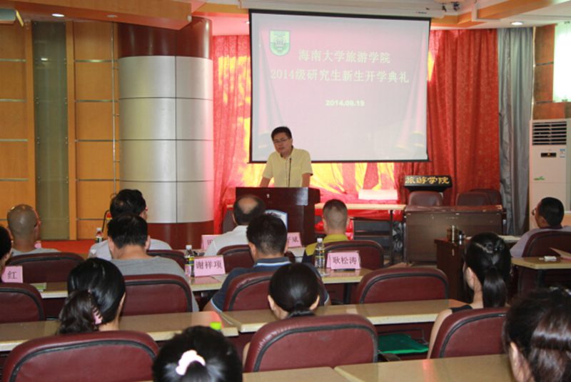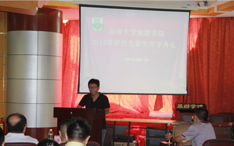2014年9月19日上午,旅游公司2014级研究生开学典礼在公司多功能厅隆重举行。参加典礼的有全体院领导、全体硕士研究生导师、研究生教学秘书与辅导员、2014级旅游管理、技术经济及管理、外国语言学与应用语言学等三个专业的全体新生。典礼由副经理孙建军主持。