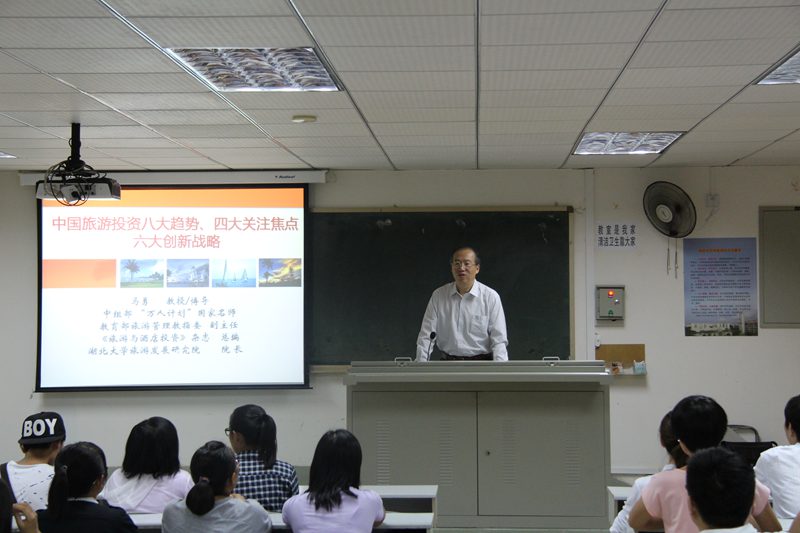 马勇教授任职于湖北大学,博士生导师,是湖北大学旅游发展研究院经理,同时还兼任教育部旅游管理教学指导委员会副主任、中国旅游协会教育分会副会长等职务。此次讲座中,马勇教授重点介绍了中国旅游投资与开发中呈现出的八个发展趋势,即国内竞争国际化、开发定位主题化、功能提升高端化、项目打造集群化、区域形态园区化、盈利模式多元化、文化挖掘显性化和价值实现多元化,在每一个趋势介绍中,马勇教授都引用了丰富的案例,让同学们都听得兴致盎然,引起了大家的强烈反响,幽默风趣的演讲风格获得了聆听学子们的广泛好评,讲座内容使大家对中国旅游投资的趋势和盈利模式有了一定了解,吸取了书本上没有的知识,大大扩展了知识面,使广大聆听学子受益匪浅。