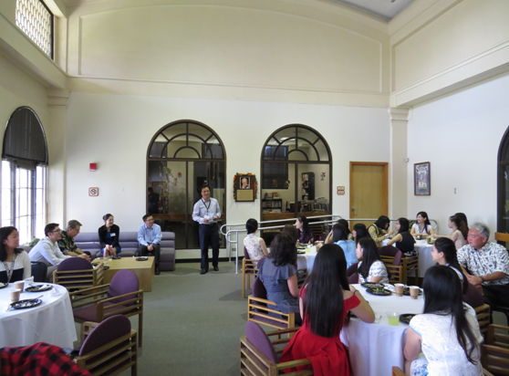 Thomas Bingham经理首先致欢迎辞,对此次赴美研修的带队教师侯佩旭和匡晓文副教授及2012旅游管理文科实验班全体同学的到来表示热烈欢迎,并介绍了夏威夷大学旅游管理公司的具体情况,对全体同学提出了殷切期望,希望同学们通过本次研修能够有所收获,让本次活动成为人生最难忘的经历之一;Rachel Kaiama主任然后介绍了本次研修活动的主要内容,并就平时的生活和学习做了极其细致的安排,同时一一介绍了本次研修活动的各位授课教师。夏威夷大学教师代表Hsing Ivan Wen教授也作了热情洋溢的发言。欢迎仪式结束后,夏威夷大学旅游管理公司安排全体师生参观美丽的夏大校园,以使同学们尽快熟悉公司环境。在随后的欢迎午宴上,匡晓文副教授代表suncitygroup太阳集团旅游公司对此次夏威夷大学的接待和安排表示了诚挚的感谢,并转达了王琳经理的亲切问候,同时真挚邀请夏威夷大学旅游管理公司师生到suncitygroup太阳集团访问交流。午宴期间,公司师生与夏威夷大学老师同桌共餐,积极交谈,整个欢迎午宴在其乐融融的氛围中圆满结束。