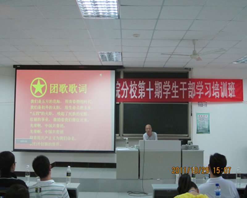 此次典礼共分四项议程。在典礼正式开始之前,全体起立,唱团歌,大家伴着青春的旋律,昂扬着斗志,用饱满的活力唱出共青团员的心声。随着歌声的结束,旅公司党委副书记金晟老师发表了讲话,金老师首先告诉同学们要“讲义气”。“讲义气”中的“义气”幷非狭义上理解的义气,而是浩然之气,金老师告诉大家在集体中要学会以和为贵,发挥团队的力量。与此同时,金老师还告诉大家要“有智慧、有勇气、有胸怀”,主要教导我们应具有良好的品质,以勇气改变那些我们可以改变的事情,以胸怀去包容那些我们暂时无法改变的事情,以智慧去区别那些自己能否改变的事情。最后金老师还强调“平等”、“公正”、“自主”,只有有了平等我们才会拥有尊严,才能有担当、有责任感,才能公正地去对待每一件事情,去改变或创造一些东西,为生活增添乐趣。紧接着院团委副书记黄良颖老师和同学分享了他的一些经验和看法,他希望同学们能认真对待团校培训,并通过这次培训,提升自己的自身素质,将共青团的精神传承下去。最后一个环节是员工干部们的风采展示,大家一起观看了旅院三大组织自编自导的VCR,同学们精彩的亮相让整个教室洋溢着欢乐激动的气氛。在接近尾声之际,主持人宣读了团校培训的考核内容,以及团校管理制度,并希望大家都能认真遵守,按时到场。