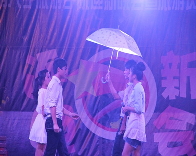 晚会的开场舞是由B-BOX协会带来的BEAT BOX,在现场灯光师的配合下,观众的热情立刻被点燃。动感的音乐,跳动的节奏预示着今晚的晚会将会是一场青春的盛宴。值得一提的是,微博协会也加入到了本场晚会的报道中,晚会也与时俱进,在网上“潮”一回。此次晚会共分三个篇章,在第一篇章中,既有LASHOW舞团带来的动感的街舞,又有深情的男女对唱,男女生之间的青涩情感被两位演唱者表现的淋漓尽致,同时也把观众带入到了一个浪漫的世界。而旅院文工团带来的话剧《明天又是一天》则又将观众的思绪拉回到了我们的高中,拉回到了我们的那段青葱岁月。演员们精湛的演技赢得了观众如雷般的掌声。如果说话剧是在展示演员的演技,那舞蹈《印度新娘》则展示了舞者优雅的舞姿。扭动的腰肢,顾盼生辉的双眸,无不向我们传递着异域的风情。在互动环节,11位热心观众学习了基本的印度舞舞步。他们的Show time将现场气氛推向了一个新的高潮。