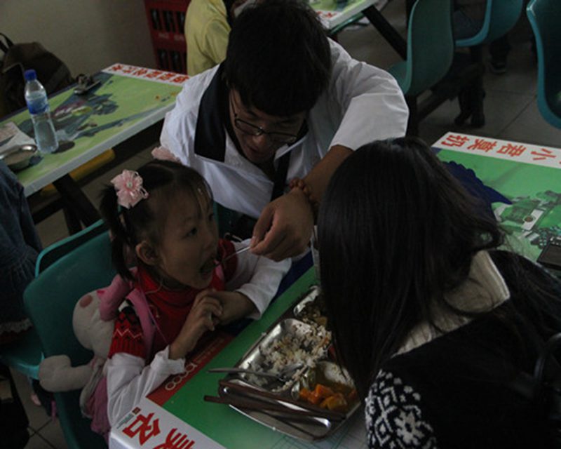 不知不觉,时间已到中午,工作人员组织各个“家庭”一起到旅院第一食堂就餐。就餐时,工作人员安排每个家庭坐一张桌子,并为他们一一送餐。当看到“家长们”细心地喂自己的孩子吃饭时, 当看到每个孩子的脸上都洋溢着幸福的笑容时,在场的每个人都感动着。活动到了这里,也就接近了尾声。
