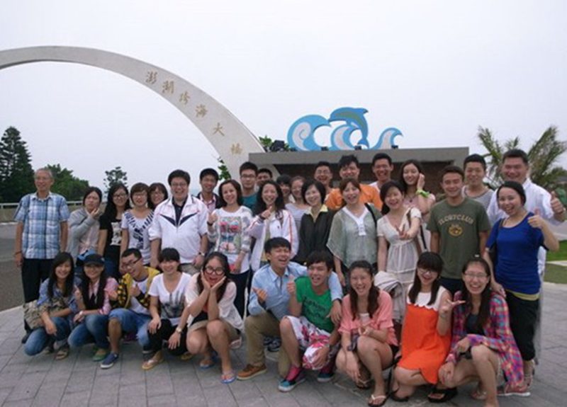 公司全体师生与文大教务长、学务长和两岸事务长在澎湖跨海大桥合影留念