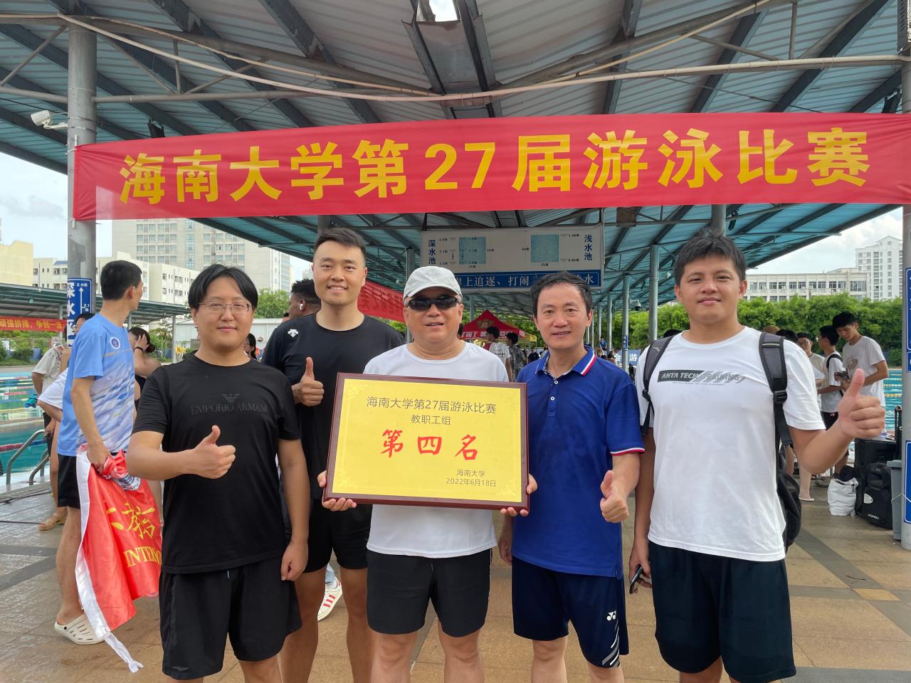 6月18日公司第27届游泳比赛在华洋游泳池拉开帷幕,公司工会组织田良、侯佩旭、陈天一、韦震、文金顺五名教职工参加比赛。最终经过教职工的顽强拼搏、团结协作,取得了教职工组总积分第四名的好成绩。其中,田良老师取得男子教工乙组100米蛙泳第六名;陈天一老师取得男子教工甲组50米自由泳第三名、100米蛙泳第四名;韦震老师取得男子教工甲组100米蛙泳第六名;文金顺老师在男子教工甲组100自由泳、100米蛙泳比赛中均取得第一名;四位老师组成的接力队取得4乘50米自由泳接力第一名。公司共计取得3个项目的第一名,数量并列教职工组第一。