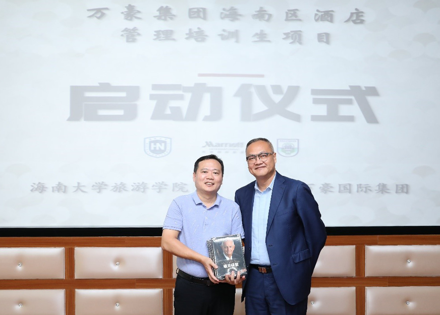 万豪海南区商会主席及三亚亚龙湾万豪度假酒店总经理高锦洪代表万豪国际集团海南区酒店方向旅游公司赠予了承载了万豪集团文化与历史的《毫无保留》精装书籍,旅游公司韩力光书记代表旅游公司接受了赠书。
