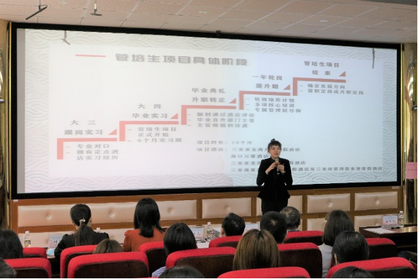 启动仪式后,万豪海南地区人力资源总监及三亚亚龙湾万豪度假酒店人力资源总监谢睿女士对管培生项目进行了简介,阐述了万豪“以人为本”的理念,希望把优质的种子从老师手中接过来,播种在万豪这片沃土上,并祝愿同学们能够仗剑天涯,不负韶华。
