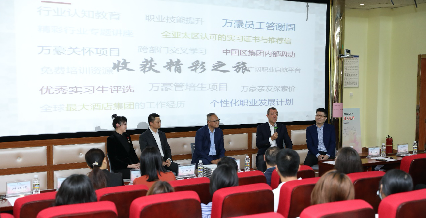 随后,来自四家酒店的五位高管面向观众落座,针对管培生项目和酒店行业为同学们答疑解惑。同学们就职业生涯、行业前景、从业素质等问题向高管们提出了问题,高管们予以耐心解答。其中Ulf Pauschardt(沃尔夫)先生以诙谐幽默的语言讲述了自己从基层员工到总经理的职业生涯,并向同学们提出一个简单却本质的问题:你是否真的想从事酒店行业?他提出,从基层到高管,是一个从枯燥到有趣的过程,并祝愿同学们能拥有美好的职业生涯。