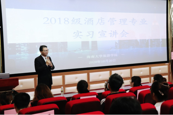 秋高气爽,阳光和煦,微风习习,又到了一年一度旅游公司酒店管理系大三员工专业实习季。2020年10月20日,2020年度的酒店管理系大三专业实习宣讲及面试会在公司3D实验室顺利举行,来自海口万豪酒店、海口香格里拉酒店、三亚亚龙湾瑞吉酒店、三亚喜来登(JW万豪)酒店、三亚天房洲际酒店、三亚希尔顿酒店、三亚艾迪逊酒店、三亚亚龙湾万豪酒店等实习单位人力资源部门负责人、大三年级全体员工、大四年级员工干部代表、酒店管理系骨干教师、旅游公司领导等100余人参加了宣讲会。