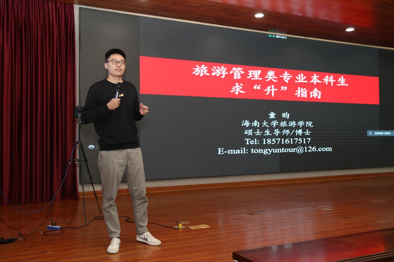 接下来suncitygroup太阳集团旅游公司硕士生导师童昀博士为旅游管理类本科生讲解了求“升”指南,童博士主要从“我是谁”,“我们是谁”,“我们能成为谁”,“我们怎样成为那个人”四个问题切入,结合自身的学习工作经历,加深了同学们对旅游管理专业的认知,提升了专业认同感,并勉励同学们天道酬勤,思想有多远,道路就能走多远。
