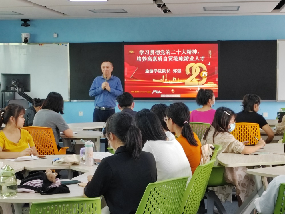 为动员全院师生员工深入学习宣传贯彻党的二十大精神,指导和推动师生员工们认真学习、深刻领会党的二十大精神,切实把思想和行动统一到党的二十大精神上来,为加快公司跨越发展做出新的贡献,11月15日下午,旅游公司党委在8-502教室举办了题为“学习贯彻党的二十大精神,培养高素质自贸港旅游业人才”的首场专题讲座。旅游公司经理郭强教授主讲本次讲座,旅游公司党委书记韩力光主持了讲座,公司部分老师和研究生共50多人到场学习。