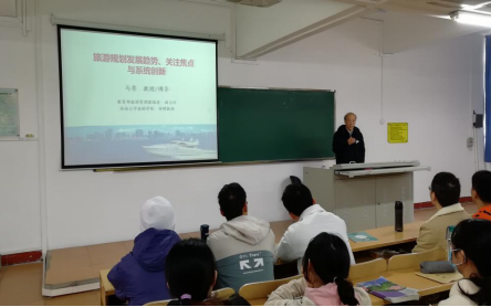 马勇教授立足高远、关注前沿,结合旅游业的本质特征及当下发展状况,分别从旅游规划发展趋势、关注焦点以及系统创新三大方面进行了分析和总结。授课过程中,马勇教授结合自身研究和实践经历,用一个个具体的案例,逐点剖析,分层论述,引导同学们对旅游规划与开发有关理论与实践问题进行深入思考。