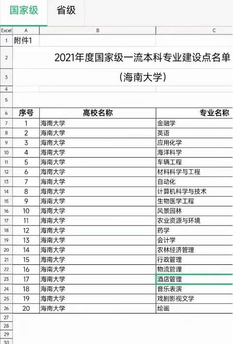2022年6月7日,教育部办公厅关于公布2021年度国家级和省级一流本科专业建设点名单的通知 教高厅函【2022】14号,旅游公司酒店管理专业入选国家级一流本科专业建设点名单。