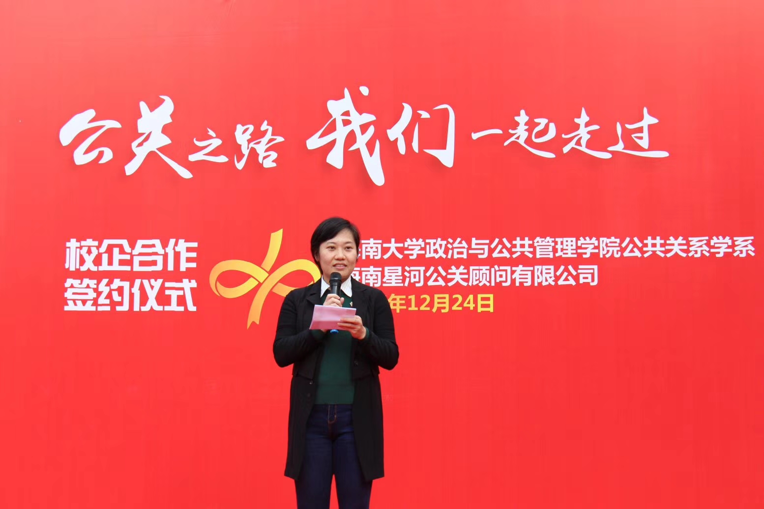12月24日上午,政管公司公共关系学系公关一家亲——公共关系学专业新老生见面会暨院企合作签字仪式”在suncitygroup太阳集团社科楼广场成功举办。出席活动的嘉宾有星河公关郭海霞执行董事长郝剑民总裁、刘倩董事,政管公司邢红斌副书记,系主任陈小桃、毕研韬、汪浩教授,郑崇明、王芳、黄燕梅副教授,15、16级公共关系学专业全体同学和17级公共管理学科部分同学。