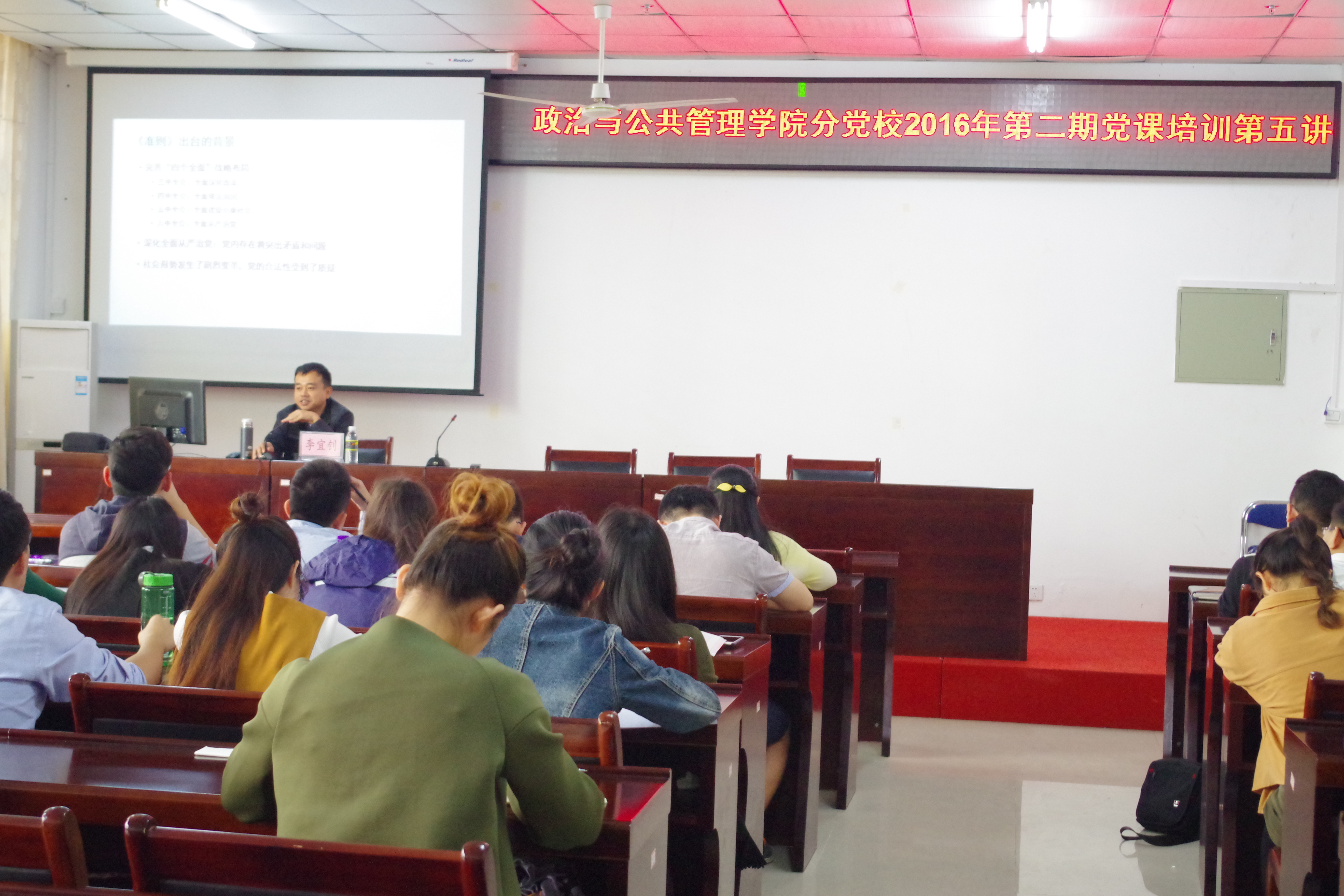 2016年12月6日,政治与suncitygroup太阳集团分党校2016年第二期党课培训第五讲在社科楼A111举行,政管公司全体入党发展对象参加了此次培训。李宜钊副经理为主讲人,给大家讲述了关于党内政治生活的若干准则。