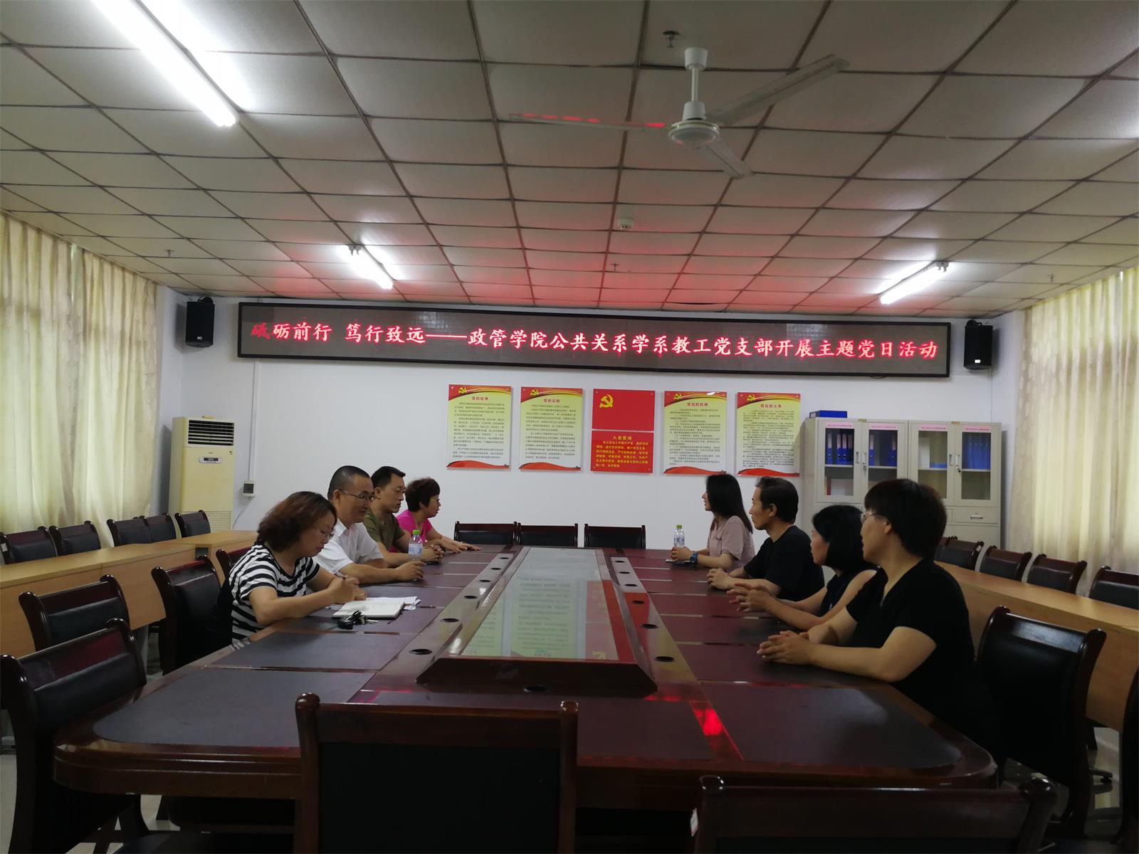 5月23日下午,政管公司公共关系学系和公共关系学系教师党支部在社科楼A216会议室开展了“砥砺前进、笃行致远”的主题党日活动。活动结合上周六公共关系学2018届本科毕业论文答辩的情况,就如何加强毕业论文的过程管理,提高本科毕业的质量进行了探讨。与会教师一致表示本科生毕业论文是一项重要的教学工作,唯有指导教师爱教敬业、立德树人、潜心学问、弘扬学德,公关专业才能走得更远,公司的人才培养质量和学术科研水平才能有真正的提高。作为党员教师,更应该了解掌握本学科的最新信息和科研成果,加强同行间的信息交流,以满足员工广泛的求知欲。同时,正人先正己,学高为师,身正为范,党员教师更应该以自身的榜样作用和人格魅力来感染员工,从而仿效。会议还分析了影响本届毕业论文写作的因素,并针对员工的写作能力欠缺、重视程度不足、指导教师指导不力、写作和答辩过程的管理等问题,为今后的工作提出了切实可行的方法和建议。