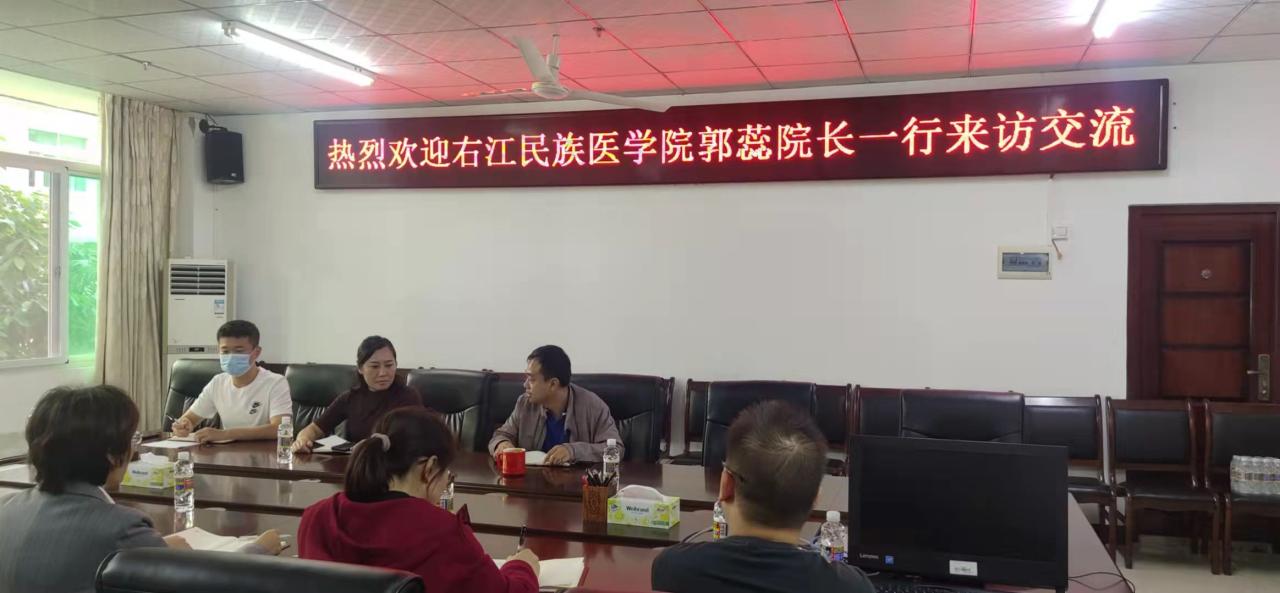 2021年10月25日上午,在社科楼A213会议室,右江民族医公司公共卫生与管理公司郭蕊经理、张文玲副书记一行莅临公司访问交流。李宜钊经理对右江民族医公司同行的到来表示热烈欢迎,邢红斌副书记等参与了座谈。