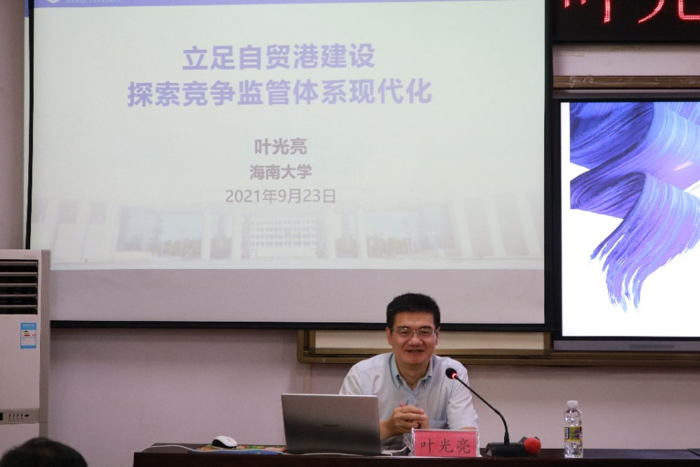 叶光亮教授以“立足自贸港建设,探索竞争监管体系现代化”为题,详细阐述了海南自由贸易港建设的现状和前景。他首先为大家介绍了自贸港“6+1+4”的制度设计,充分展示了海南作为高水平开放窗口的制度优惠与突破。接着,叶光亮教授为大家讲解了竞争政策的历史与发展现状,以生动可感的案例引导同学们理解和思考竞争政策建立的必要性与重要性。他指出,高水平开放离不开基于竞争政策的高质量监管,建设基于人工智能和区块链的公平审查技术体系与平台将成为解决审查需要的良方。同时,叶光亮教授强调,公共管理类专业人才在自贸港政策建设中大有可为,并对公司员工寄予殷切希望,鼓励员工树立高远志向,热情投入自贸港建设的队伍,以跨学科的交叉视角为自贸港建设作出贡献。